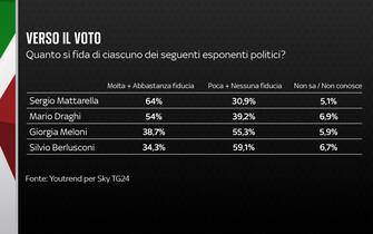 Dopo la crisi del governo Draghi e con all'orizzonte le elezioni del 25 settembre, la fiducia nel presidente del Consiglio uscente cala ma rimane alta (54%). Ancora più alta la fiducia nel presidente della Repubblica Sergio Mattarella (64%). È quanto emerge da un sondaggio realizzato dall'istituto di ricerca Quorum/YouTrend per Sky TG24
