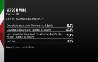 Fra gli elettori del Pd, il 50,4% preferirebbe un'alleanza con i partiti di centro. Una coalizione con il M5s è l’opzione meno gradita (12,4%), meglio andare da soli (25,4%)