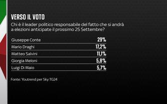 Conte è considerato dagli intervistati anche il principale responsabile delle elezioni anticipate del prossimo 25 settembre (29%). Rispetto al dato sulla crisi di governo, vengono date in questo caso più responsabilità a Draghi (17,2%) e a Salvini (11,1%)