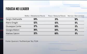 In base al sondaggio, le figure in cui gli italiani ripongono maggiormente fiducia sono ancora il Presidente della Repubblica Sergio Mattarella (59%) e il Presidente del Consiglio uscente Mario Draghi (52%). Seguono i leader di partito Giuseppe Conte (37%), Giorgia Meloni (36%) e Matteo Salvini (32%)