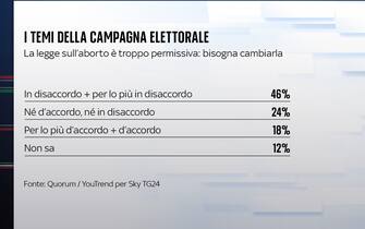 Dal sondaggio emerge poi che il 46% degli italiani ritiene che la legge sull'aborto non sia troppo permissiva e non vada modificata
