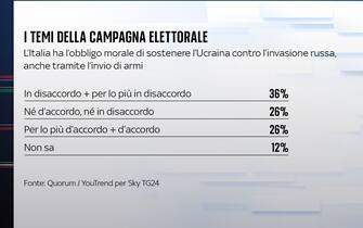 In tema di guerra in Ucraina, il 36% invece ritiene che l’Italia non abbia alcun obbligo di sostenere militarmente l’Ucraina contro l'invasione russa