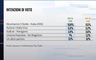 Il M5S è al 13,8% (12,1% la scorsa settimana). Azione/Italia Viva 5,5%, ItalExit al 2,4% e Unione Popolare all’1%