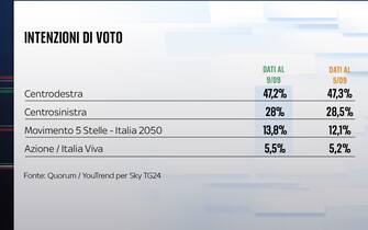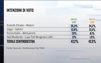 Per quanto riguarda le intenzioni di voto, la coalizione di Centrodestra è al 47,2% (47,3% la scorsa settimana) mentre il Centrosinistra al 28% (28,5% la scorsa settimana)