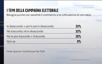Anche sulla criminalizzazione della coltivazione e commercio delle droghe leggere c’è un leggero saldo a vantaggio di chi è contrario (+7%)