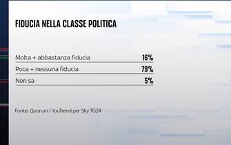 Per quanto riguarda la fiducia nella politica in generale, gli italiani continuano a non riporne (79%). Solo il 16% si fida molto o abbastanza