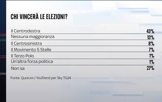 Il 43% degli italiani ritiene che le elezioni saranno vinte dal Centrodestra, mentre il 13% pensa che dalle urne non emergerà nessuna maggioranza. Secondo l'8% vincerà il Centrosinistra, secondo il 7% il M5S