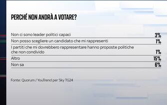 Il 3% non andrà a votare perché ritiene che non ci siano leader politici capaci, l'1% perché non trova un candidato che lo rappresenti e un altro 1% non condivide le proposte politiche del partito che dovrebbe rappresentarlo. Il 6% non andrà a votare ma non sa dire con precisione per quale motivo