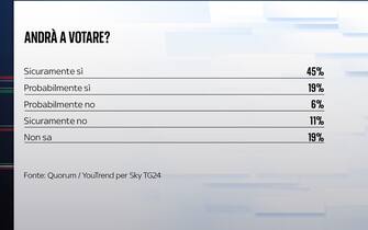 Il 45% degli italiani dichiara che il 25 settembre andrà sicuramente a votare, percentuale che sale al 64% aggiungendo anche chi probabilmente andrà alle urne. È quanto emerge dal sondaggio realizzato dall’istituto di ricerca Quorum/YouTrend per Sky TG24