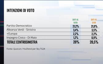 Il Pd è secondo nelle intenzioni di voto con il 21,2% (21,9% la scorsa settimana). Sinistra italiana/Europa Verde si attestano al 3,4%, +Europa è stabile al 2,2% e Impegno Civico è all'1,2%