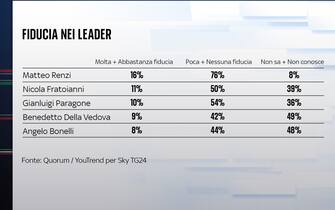 Seguono Matteo Renzi (16%), Nicola Fratoianni (11%), Gianluigi Paragone (10%), Benedetto Della Vedova (9%) e Angelo Bonelli (8%)