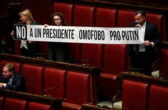 Poco prima dell'inizio della quarta votazione che ha eletto Lorenzo Fontana presidente della Camera dei deputati, alcuni parlamentari del Pd hanno esposto un grande striscione con la scritta "No a un presidente omofobo pro Putin", riferendosi all'esponente della Lega