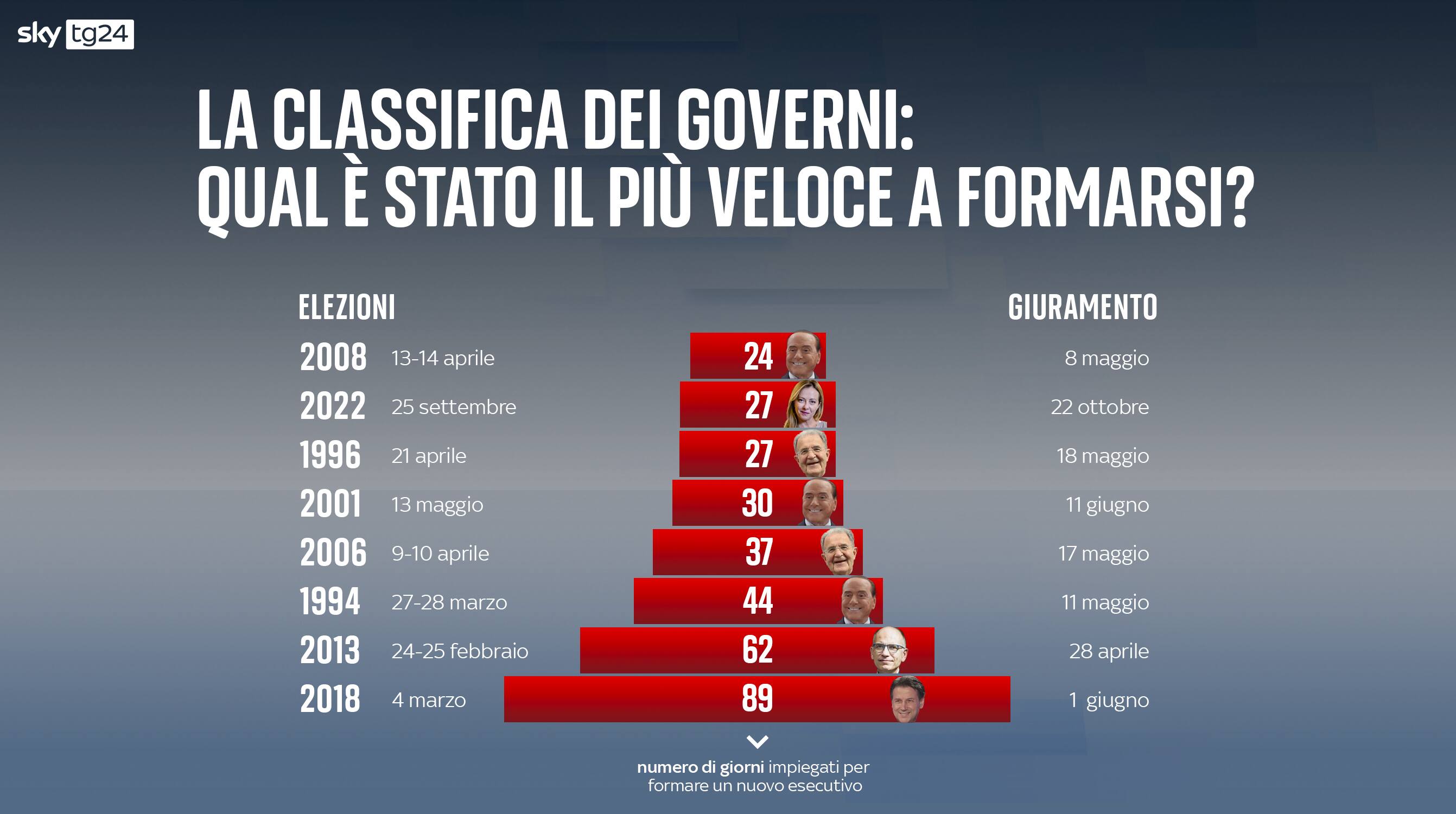 Il multipolarismo ha portato con sé nuove complicazioni e un allungamento della fase di transizione tra le urne e la cerimonia di impegno solenne al Quirinale. Letta ricevette l’incarico ben due mesi dopo il voto. Nei 62 giorni che passarono venne eletto Giorgio Napolitano per il suo bis. Mai quanto Conte che ha rosicchiato piano piano il primato del Dottor Sottile, dopo due giri di consultazioni e due mandati esplorativi di cui uno con supplemento temporale. Amato aveva collezionato la bellezza di 83 giorni di travaglio. Con la Meloni si è spinto sull'acceleratore. Il colloquio della coalizione con il Presidente della Repubblica Mattarella è durato solo 11 minuti e Meloni ha accettato l'incarico senza riserva. La nuova Premier tra gli esecutivi del post 1992 è seconda solo al Berlusconi IV che impiegò 24 giorni, a pari merito con il primo governo Prodi.