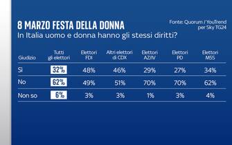 PARITÀ DI GENERE – L’8 marzo è alle porte e come sempre si riflette sulla parità di genere. Secondo molti italiani si tratta di un obiettivo ancora lontano. Per il 62% degli intervistati uomini e donne in Italia non godono degli stessi diritti