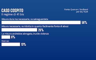 41-BIS – Mentre continuano le manifestazioni degli anarchici e dei loro simpatizzanti a favore di Alfredo Cospito, da quattro mesi impegnato in uno sciopero della fame come protesta per il 41-bis, dal sondaggio emerge che più della metà degli italiani (56%) ritiene che il carcere duro non vada toccato: è considerato una norma necessaria, e solo un quarto degli italiani ritiene che sia uno strumento che presti il fianco troppo facilmente ad abusi. Soltanto una percentuale residuale di italiani ritiene che il 41-bis sia un istituto sorpassato