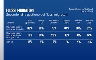 Flussi migratori. Che il tema debba essere affrontato a livello europeo e non dai singoli Stati è un pensiero trasversale, che trova d’accordo gli elettori di diversi partiti: dal 68% di Fdi all’88% degli elettori del Pd
