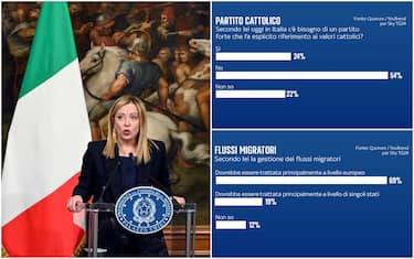 L’idea che debba esserci un partito in Italia chiaramente cattolico ha un favore relativamente molto ampio: il 24% lo troverebbe una buona cosa. Il giudizio sul governo guidato dalla leader di FdI rimane a metà, sospeso tra bocciatura e promozione. È quanto emerge dall’ultima rilevazione di Quorum/YouTrend per Sky TG24. Al centro del sondaggio, anche il tema migranti: la frase del ministro dell’Interno Piantedosi dopo il naufragio di Cutro polarizza l’opinione pubblica