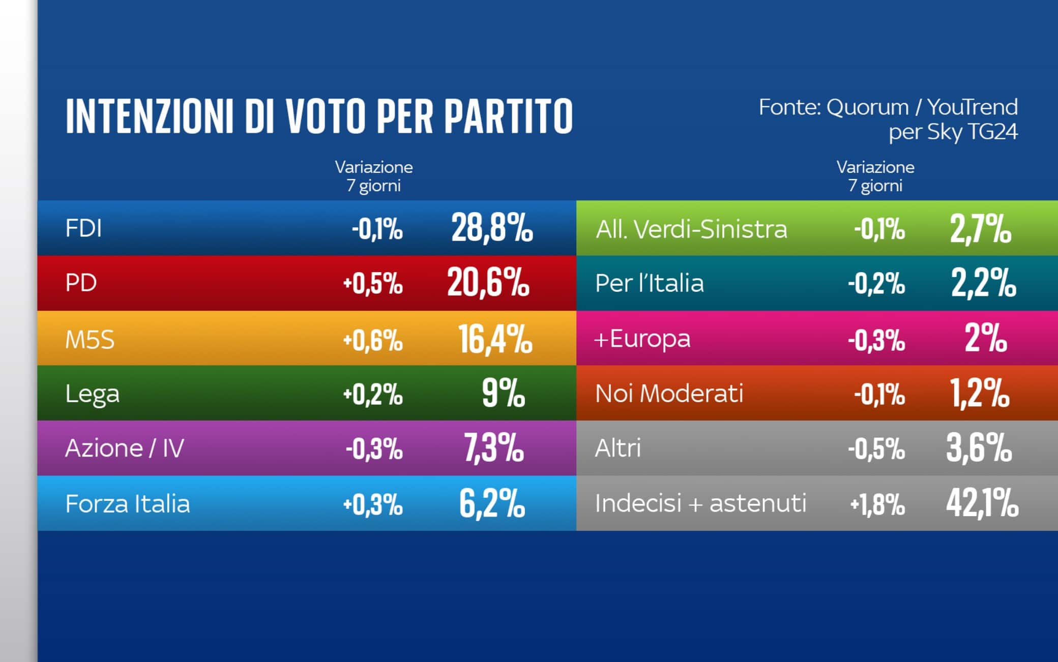 Secondo quanto emerge dal sondaggio realizzato oggi lunedì 3 aprile dall’istituto di ricerca Quorum/YouTrend per Sky TG24 per quanto riguarda le intenzioni di voto, Fratelli d’Italia rimane stabile poco sotto il 29%, mentre continua la crescita del Pd che, dopo aver superato per la prima volta in questa legislatura il 20% la settimana scorsa, guadagna un altro mezzo punto. Crescono anche il M5S e gli altri partiti di centrodestra, calano leggermente tutti gli altri.