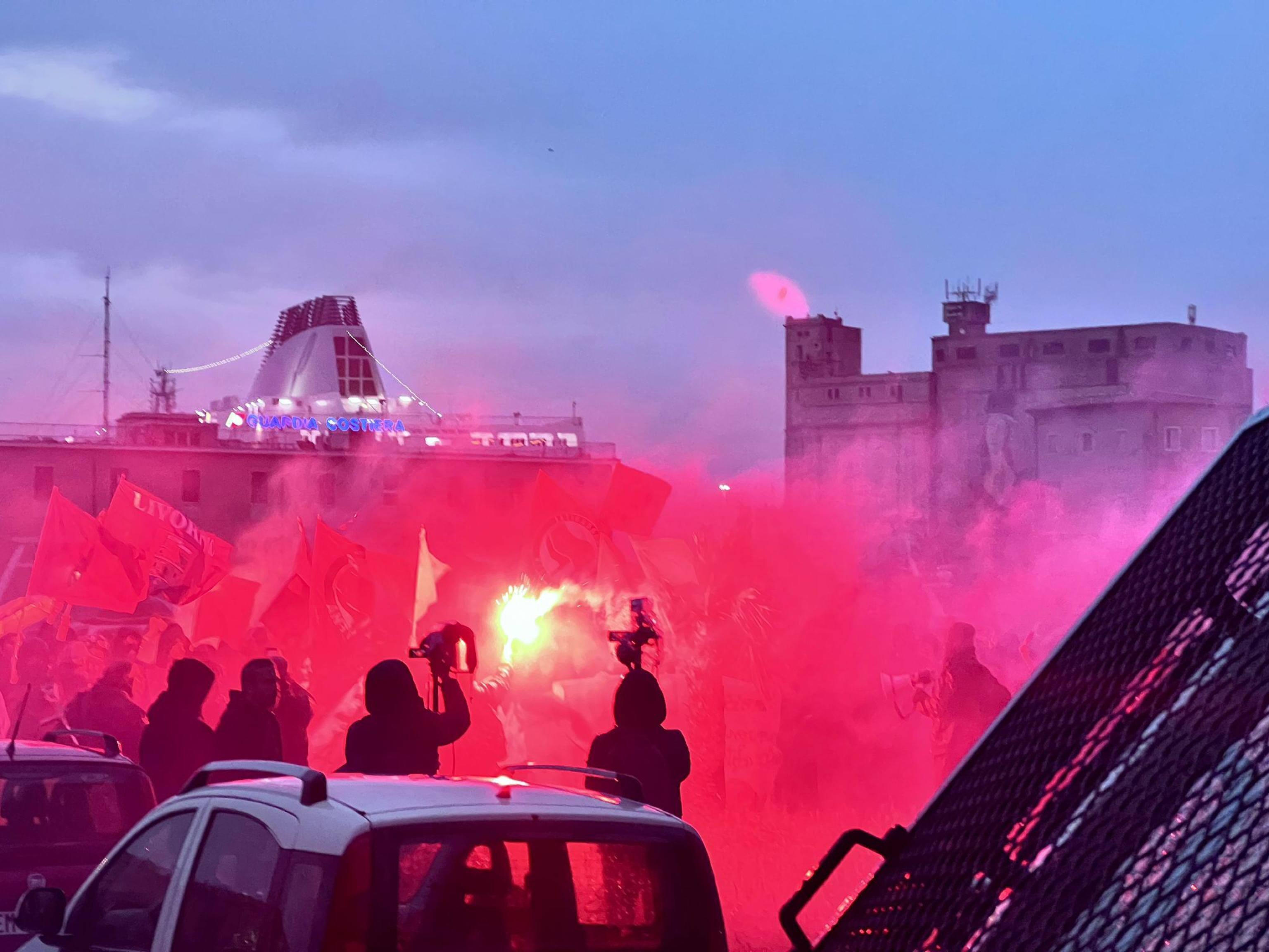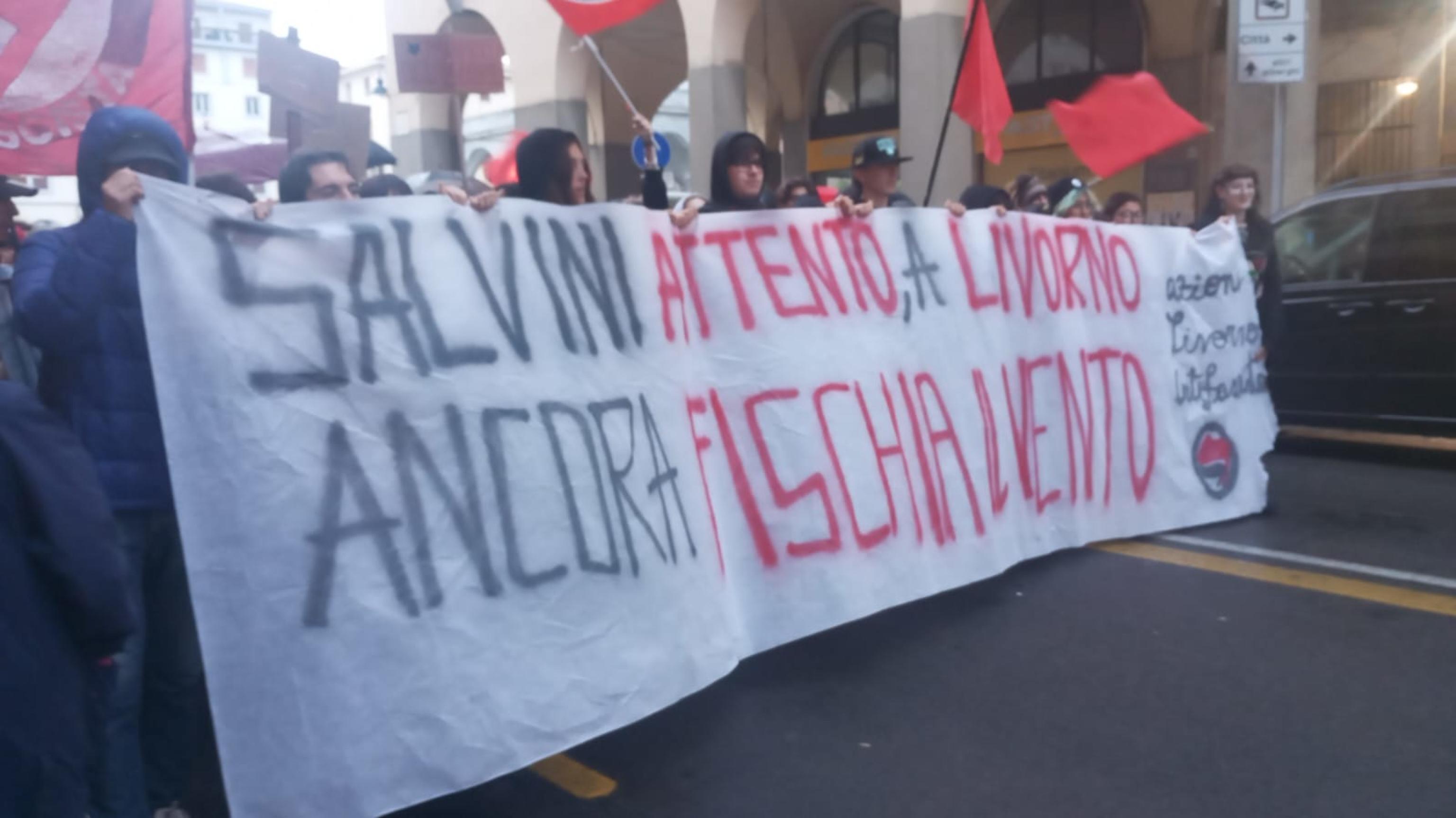 Già prima dell'evento sul retro del palazzo dei portuali livornesi era iniziata la protesta. "Salvini attento, a Livorno ancora fischia il vento", recitava uno striscione esposto da Azione Livorno Antifascista in testa al corteo che da piazza Grande ha mosso poi verso il teatro. "Livorno è una città antirazzista e antifascista e noi siamo qui in piazza a manifestare le nostre idee che sono contrarie a quelle del ministro Salvini", ha detto Luca Ribechini, dell'associazione Livorno Porto Pulito. "Siamo qui perché un ministro non viene a Livorno in qualità di ministro, ma a provocare a fare propaganda in una struttura, il teatro 4 Mori che per noi non ha nulla a che vedere con le idee politiche di Salvini", spiega Massimo Mazza, rsu Alp e coordinamento nazionale porti Usb. "Nessuno vuole impedire a nessuno di parlare - ha aggiunto - e non crediamo che un ministro abbia difficoltà di parlare tra organi di stampa e tv, a noi non ci sembra condivisibile la sede in cui parla".