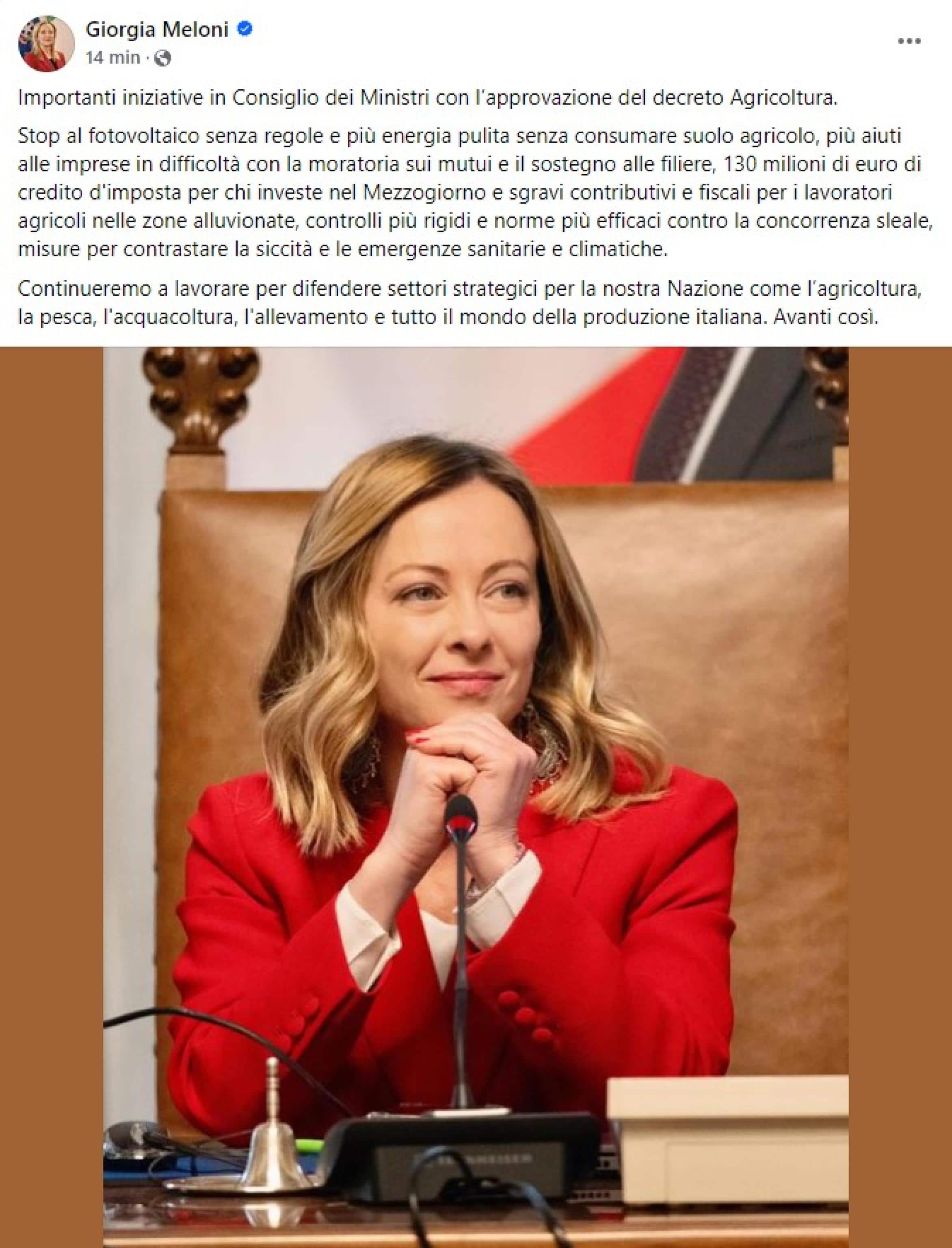 "Stop al fotovoltaico senza regole e più energia pulita senza consumare suolo agricolo, più aiuti alle imprese in difficoltà con la moratoria sui mutui e il sostegno alle filiere, 130 milioni di euro di credito d'imposta per chi investe nel Mezzogiorno e sgravi contributivi e fiscali per i lavoratori agricoli nelle zone alluvionate, controlli più rigidi e norme più efficaci contro la concorrenza sleale, misure per contrastare la siccità e le emergenze sanitarie e climatiche". Lo scrive sui social Giorgia Meloni.