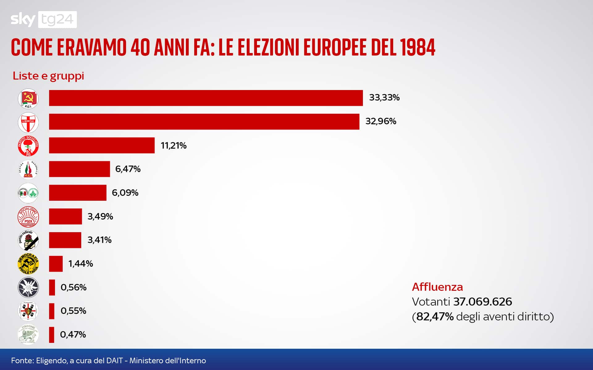 Per la prima volta il Partito comunista italiano era il partito più votato. Un risultato senza precedenti nella storia dell’Italia repubblicana, messo a segno a pochi giorni dalla morte del “Segretario” Enrico Berlinguer che, colpito da un ictus durante un comizio alle battute finali della campagna, morì l’11 giugno in ospedale. Proprio dalla fine degli anni Settanta Berlinguer si era impegnato in un processo di ancoraggio agli ideali di integrazione comunitaria e di abbandono delle pregiudiziali anti-europeiste. Le speranze che l'esito favorevole preludesse anche a un “sorpasso” nazionale della Democrazia cristiana si infransero nell’87 e ancora prima alle amministrative dell'85. Quell’appuntamento elettorale segnò anche il debutto europeo della Liga Veneta, embrione della futura Lega Nord, che però non raggiunse il quorum.