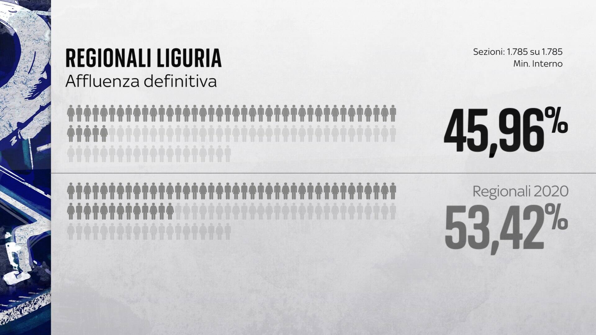 Lo riportano i dati del portale Eligendo del Ministero dell'Interno sul totale delle sezioni scrutinate (1.785 su 1.785). Il calo è stato di 7,46 punti percentuali. A Genova, in particolare, l'affluenza è scesa di 5 punti rispetto alla precedente tornata elettorale