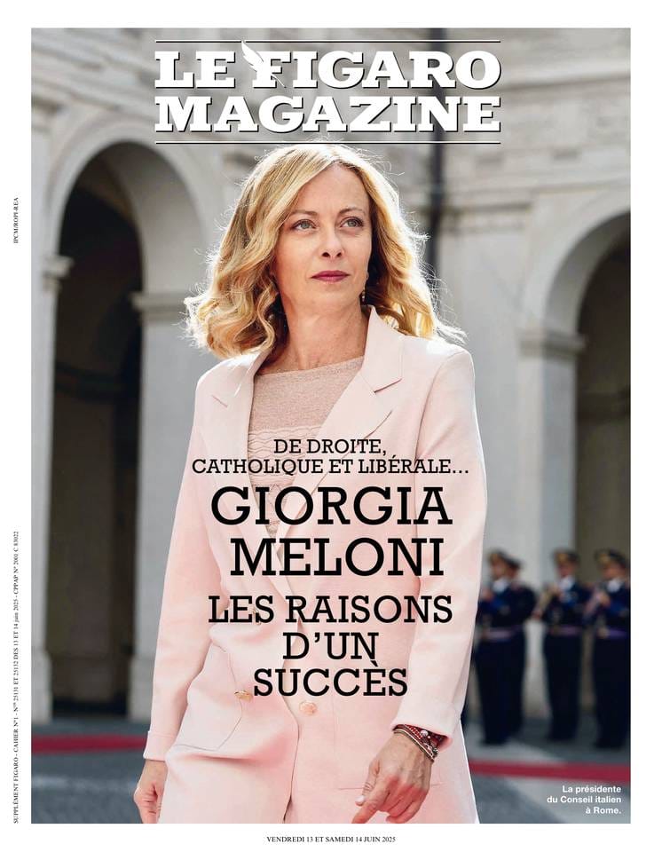 Le Figaro Magazine, importante magazine francese, dedica la copertina a Giorgia Meloni e titola: 'Giorgia Meloni, le ragioni di un successo'. All’interno un lungo reportage a firma di uno degli inviati di punta del giornale francese, Jean Marc Gonin, che definisce il premier italiano la “prima donna” che non solo governa l’Italia ma ha saputo imporsi sulla scena mondiale.