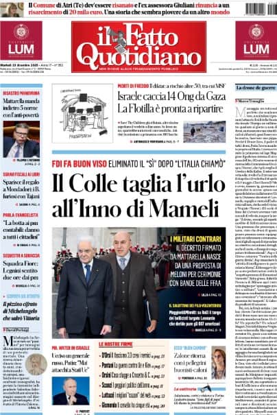 "Il Colle taglia l'urlo all'inno di Mameli". E' questo il titolo sull'edizione odierna de "Il Fatto Quotidiano". In particolare si fa riferimento ad un decreto del presidente della Repubblica, Sergio Mattarella che avrebbe eliminato il "sì" alla fine dell'inno di Mameli, dopo la frase "l'Italia chiamò". Lo stesso decreto, sottolinea il Fatto sul web, è stato firmato "dal presidente della Repubblica il 14 marzo 2025, adottato su proposta della presidente del Consiglio Giorgia Meloni e pubblicato in Gazzetta Ufficiale il 7 maggio 2025".