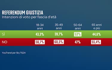Già prima dell’apertura delle urne, le intenzioni di voto raccolte da YouTrend per Sky TG24 avevano anticipato quello che poi è successo. La fascia d’età tra i 18 e i 34 anni si assestava sul No al 56,7%, seconda soltanto a quella compresa tra i 35 e i 49 anni (60,3%).