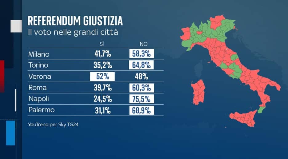 Un voto dall'esito duplice, quello che è emerso per la Lombardia al termine del Referendum sulla Giustizia (LO SPECIALE). Se, infatti, a Milano a prevalere è stato il No con il 58.3% dei voti, in Lombardia (LA MAPPA) ad imporsi è stato il Sì con il 53.56%. Numeri positivi, in entrambi i casi, arrivano guardando all'affluenza. Sia a Milano sia nel resto della regione il dato supera la media nazionale: nel capoluogo è andato a votare il 65.14% dei cittadini, in Lombardia il 63.76%.