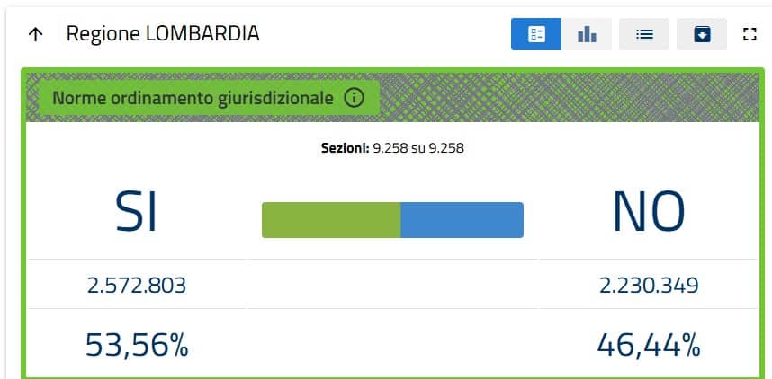 Come riporta il portale Eligendo, in tutta la Lombardia le sezioni coinvolte nelle votazioni sono state 9.258. I voti per il Sì sono stati 2.572.803 pari al 53.56% del totale, mentre i voti per il No sono stati 2.230.349 ovvero il 46.44%. Gli elettori aventi diritto, in totale, erano 7.573.433 mentre i votanti in seggio sono stati 4.828.975. Considerando sempre il voto regionale, le schede nulle sono state 16.217, mentre le schede bianche, 9.550 e quelle contestate 56. Ecco poi i numeri che riguardano solamente la città di Milano. I voti per il Sì sono stati 257.321 pari al 41.67% mentre i voti per il No sono stati 360.129 pari al 58.33% dei votanti. Considerando altri numeri, sempre limitatamente al comune del capoluogo meneghino, gli elettori aventi diritto erano 951.417, i votanti sono stati 619.790 (65,14%). Le schede nulle sono state 1.472, quelle bianche 853 e quelle contestate 15.