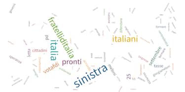 Una nota sul metodo. Per elaborare le word cloud, Sky Tg 24 ha scaricato tutti i post pubblicati su Twitter dagli account dei leader dei principali partiti dal 21 luglio, giorno delle dimissioni di Mario Draghi, fino alle 10 del 29 agosto. Le parole contenute nei tweet sono state estratte da un software di analisi dei testi che ha eliminato quelle di uso più comune (come, per esempio, gli articoli), e ha calcolato la relativa frequenza dei termini: i primi 100 per ciascun account sono stati infine visualizzati attraverso le nuvole di parole.