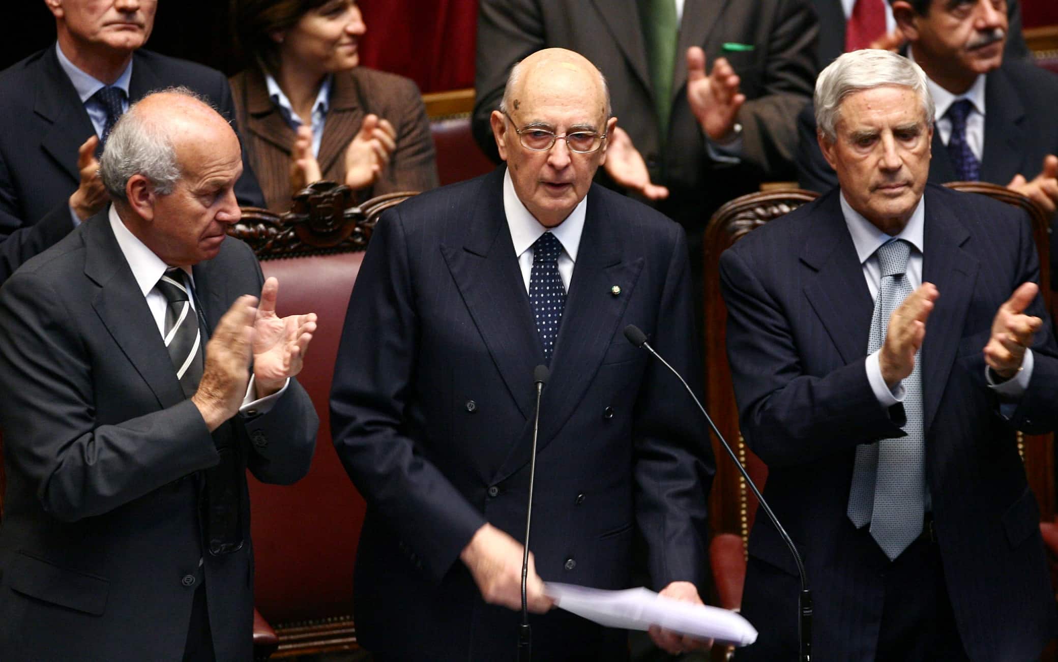 Nel 2006 arriva il momento di eleggere il successore di Ciampi. Le prime ipotesi vedono tra i papabili Franco Marini, Emma Bonino e Massimo D’Alema. Il centrosinistra vota scheda bianca per tutte le prime tre votazioni. Il centrodestra vota invece Gianni Letta alla prima votazione, per poi votare scheda bianca le altre tre. Alla quarta votazione viene eletto Napolitano, con 543 voti su 990 votanti (1009 gli aventi diritto). È il primo esponente proveniente dal Pci a diventare capo dello Stato.
