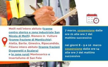 Nell'abitato di Lavello l'8, il 9 e il 10 marzo, sospensione nelle sole ore notturne, dalle ore 21 alle ore 7 del mattino successivo. Negli abitati di Montemilone e Palazzo San Gervasio, l'8, il 9 e il 10 marzo, l'erogazione idrica nel centro abitato potrà subire cali di pressione o sospensioni temporanee dalle ore 21 alle 7 del mattino successivo.