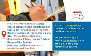 In particolare, negli abitati di Melfi (tranne centro storico e zona industriale di San Nicola), Rionero in Vulture (tranne frazioni di Monticchio e zona C10), Atella, Barile, Ginestra, Ripacandida, Filiano (tranne frazioni Dragonetti e Scalera) e le zone rurali Monteserico e Insertafumo di San Fele, la sospensione è prevista il 21 marzo, dalle ore 21 alle 7 del mattino successivo; il 22, 23 e 24 marzo, dalle ore 14 alle 7 del mattino successivo.