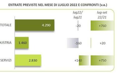 Rispetto allo stesso periodo del 2021, "quando le entrate previste furono 4.310" - conclude la nota - "calano gli ingressi nel settore industria (-160) e aumentano quelli nei servizi (+140), mentre la proiezione luglio-settembre fa segnare indici superiori allo stesso trimestre del 2021 sia nei numeri complessivi (+760 ingressi) che nei servizi (+750) e nell'industria (+20)". (ANSA).