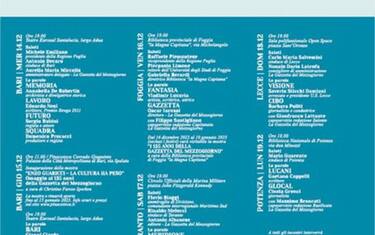 Infine, Potenza, lunedì 19 dicembre. Non solo le parole ma anche due mostre da visitare: il 15 dicembre si apre a Bari alla Pinacoteca Metropolitana l'esposizione "Enzo Guaricci - La cultura ha peso", come omaggio ai 135 anni della Gazzetta del Mezzogiorno, a cura di Christine Farese Sperken, visitabile sino al 15 gennaio 2023; il 16 dicembre a Foggia l'inaugurazione della mostra "I 135 anni della Gazzetta del Mezzogiorno", a cura della Biblioteca "la Magna Capitana" e aperta fino al 10 gennaio 2023. (ANSA).