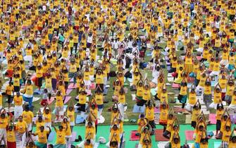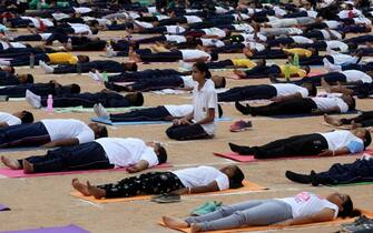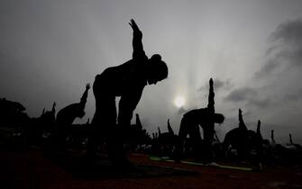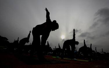La giornata internazionale dello Yoga, istituita nel 2014 dalle Nazioni Unite, si celebra in varie parti del mondo con pratiche fisiche, spirituali e mentali. Nella foto, i membri del National Cadet corps (NCC) a Bangalore in India