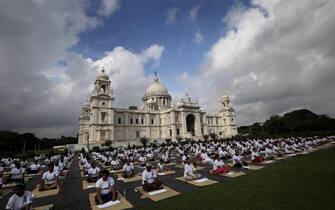 Le persone partecipano ad una sessione di Yoga vicino il Victoria Memorial a Kolkata, India