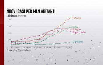 L’andamento dei nuovi casi nell’ultimo mese nei diversi Paesi, con tutta l’Europa alle prese con la quarta ondata e con Omicron