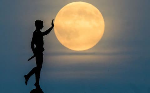 - La superluna appare all'orizzonte dietro la statua del "Tedoforo" (1937) sulla riva settentrionale del Maschsee in Germania