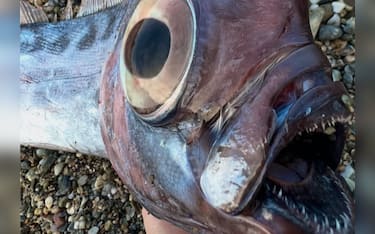 Il nome "Liocorno" non è casuale. La morfologia di questo pesce sembra uscita da un bestiario medievale. Sulla testa spicca una protuberanza simile a un corno, un dettaglio che ne accentua l'aura quasi mitica. Il corpo, allungato e nastriforme, si assottiglia verso la coda ed è solcato da una lunga pinna dorsale rossa che percorre quasi tutta la schiena, formata da raggi flessibili. Le pinne anale e caudale sono minuscole, mentre gli occhi, enormi, rivelano l'adattamento alle tenebre degli abissi. I denti, conici e disposti su tre file irregolari, sono strumenti perfetti per afferrare piccoli organismi pelagici. Al momento dello spiaggiamento, l'animale ha espulso un getto di liquido denso proveniente da un sacco interno, una strategia difensiva che richiama da vicino quella dei cefalopodi. Un particolare che aggiunge ulteriore fascino biologico a un ritrovamento già eccezionale.