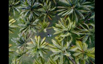 Mano nella mano con il naso all’insù: un drone ha catturato un momento romantico di una coppia sdraiata fra le palme –