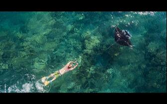 Un nuotatore esplora le acque delle isole Fiji. La vista dal drone offre una spettacolare panoramica sul fondale marino -