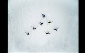 I partecipanti ad una gara di sci visti dall’alto in Russia sembrano creare un disegno geometrico sulla neve –
