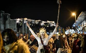 La parola “Apokria” da cui deriva il nome del carnevale letteralmente in greco significa “astensione dalla carne”. Nella foto scattata sulla collina di Filopappou, vicino ad Atene, un uomo esegue una danza tradizionale durante le celebrazioni del lunedì grasso (27 febbraio) con il quale finisce il carnevale e inizia il periodo di Quaresima –