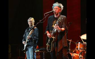Nella sua lunga carriera Clapton ha pubblicato ben 68 album e lavorato con artisti del calibro di di Bob Dylan, George Harrison, Billy Preston, Roger Waters, Aretha Franklin, Phil Collins, Sting,Joe Cocker, i Beatles, i Rolling Stones, Santana. Nella foto, Clapton sul palco del “Crossroads Guitar Festival” del 2013 con il chitarrista degli Stones, Keith Richards -