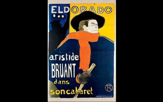 Nella produzione dell’artista anche numerosi manifesti pubblicitari, come quello ispirato ad Aristide Bruant nel suo cabaret del 1893 -(Henri de Toulouse-Lautrec Eldorado, A. Bruant dans son Cabaret 1892 Color Lithography, 138x96 cm © Herakleidon Museum, Athens Greece)