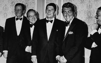 Wayne ha supportato pubblicamente in numerose occasioni il partito repubblicano americano, prendendo posizioni fortemente anti-comuniste nel periodo della Guerra fredda. Nonostante le richieste del partito, non ha mai concorso per alcuna carica politica, supportando però la candidatura alla presidenza del collega Ronald Reagan. In foto, John Wayne, Bob Hope, Ronald Reagan, Dean Martin e Frank Sinatra all'evento 'Californians for Reagan'-I presidenti Usa che hanno fatto la storia: Reagan