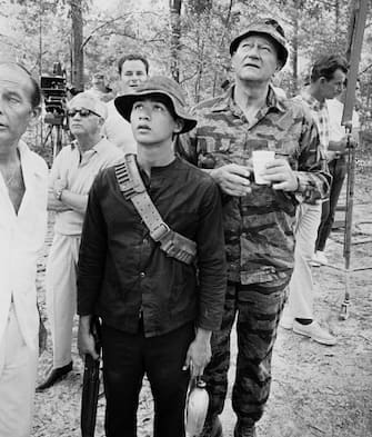 John Wayne ha espresso le sue posizioni politiche anche nelle sue due uniche prove da regista: "Alamo" del 1960 e "Berretti verdi" (nella foto sul set) nel 1968. Il primo racconta la storica battaglia tra texani e messicani del 1836, mentre il secondo film è un manifesto a sostegno dell'intervento americano in Vietnam